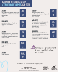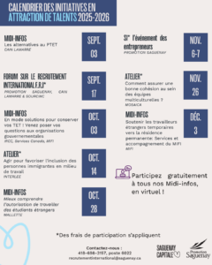 En plus de notre accompagnement personnalisé, nous offrons tout au long de l’année une programmation variée de formations et d’activités conçues pour les employeurs. Nos midi-infos, conférences et ateliers abordent des sujets concrets liés au recrutement, à l’accueil et à la rétention des talents internationaux. C’est l’occasion de rester informé sur les meilleures pratiques, les tendances du marché du travail et les évolutions réglementaires en immigration, tout en échangeant avec d’autres entreprises de la région.